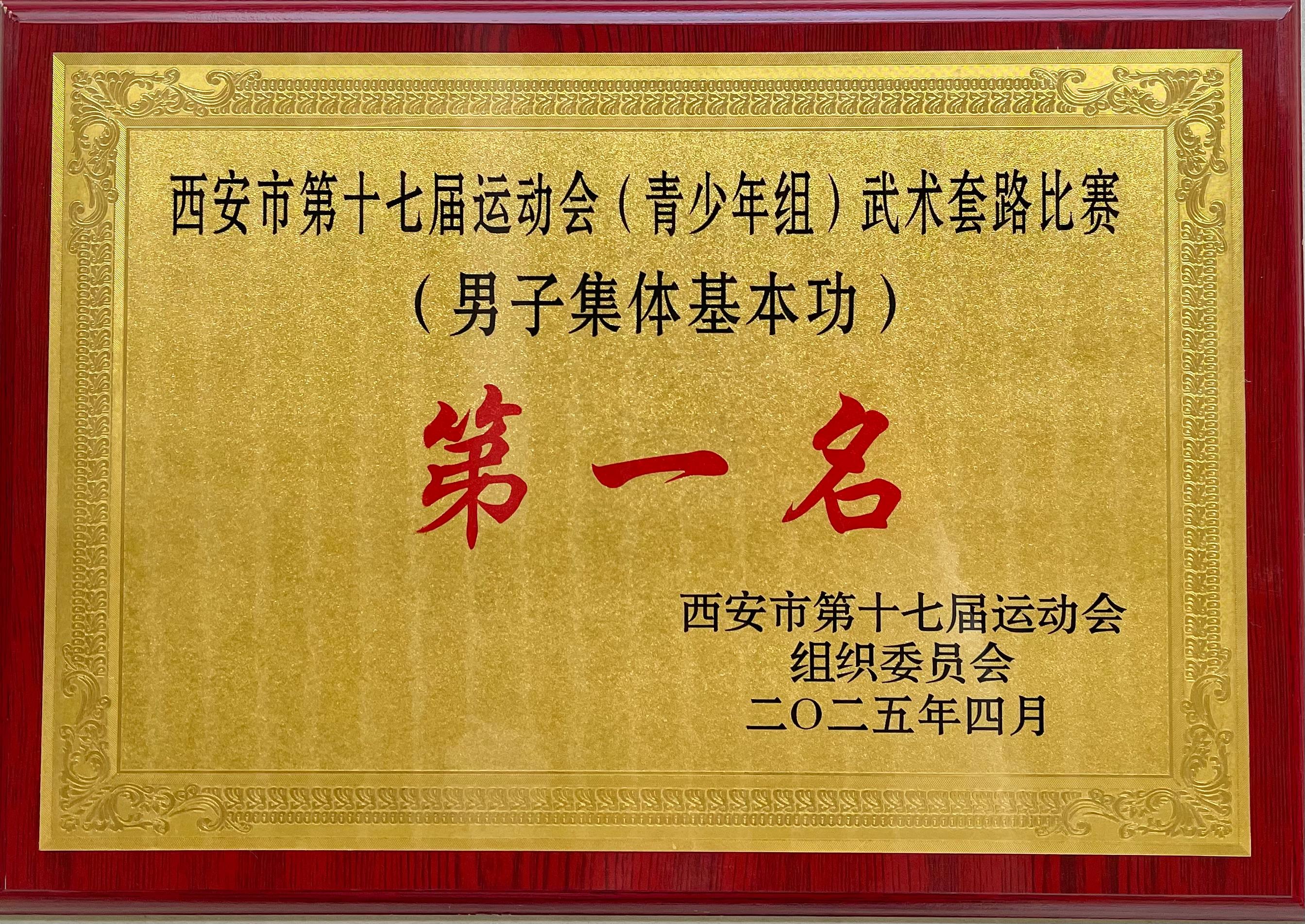 2025年4月,西安市曲江第一中学荣获西安市第十七届运动会(青少年组)武术套路比赛甲组团体总分第一名、男子集体基本功第一名、女子集体基本功第一名