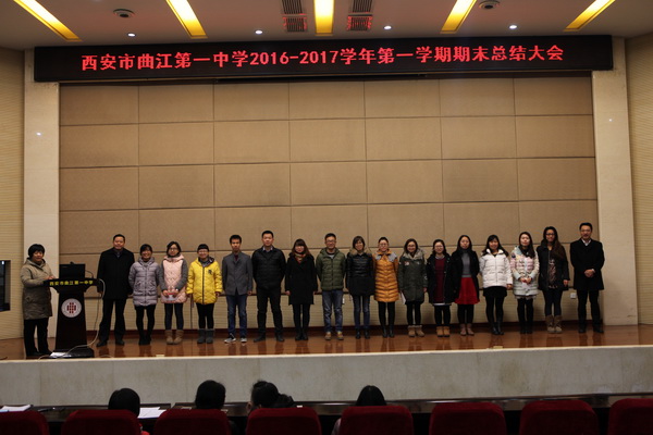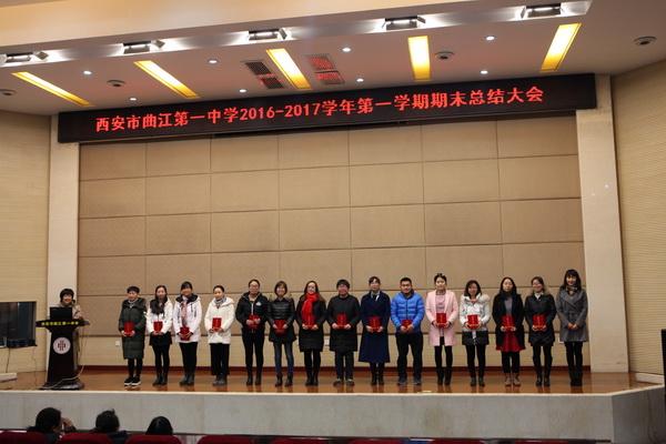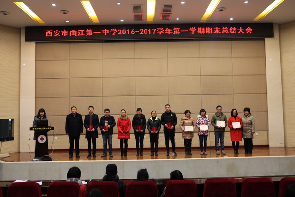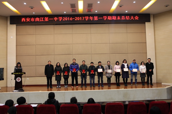 随后副校长曹琦宣读西安市曲江第一中学关于表彰2016年优秀教职工的决定,白璇、陈金叶、蔡晓梅等52位老师荣获本学年年度考核优秀教职工奖;大会第三项,副校长朱琳瑛宣读了教学教研类各项获奖情况,边团结校长、陈勇刚常务副校长及曹琦副校长为本学期获得“陕西省中小学教学能手称号”的英语教师张亚权、音乐教师黄晨以及本学年在国内外期刊上发表论文、承担课题研究及第七届赛教活动、各类教育教学成果获奖老师颁奖。