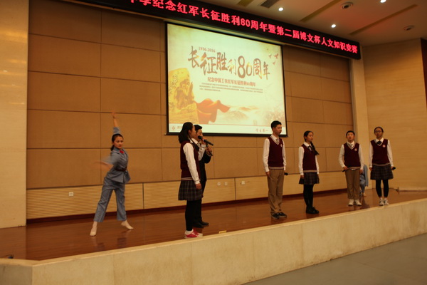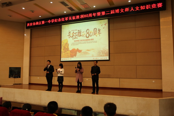 为继续弘扬中国工农红军在长征途中表现出的伟大长征精神,铭记历史不忘初心 ,走好新的长征路,激励全国各族人民为实现中华民族伟大复兴的中国梦而努力奋斗。在校领导的大力支持下,我校初2018届学生于2016年11月30日组织开展“纪念红军长征胜利80周年暨第二届‘博文杯’人文知识竞赛”。副校长曹琦老师、政教处主任余爱东老师、总务处主任王锦老师、初二年级组组长张洁老师、历史教研组组长罗红梅老师、政治教研组组长白国强老师、地理教研组组长杨光辉老师作为评委莅临本次比赛现场。