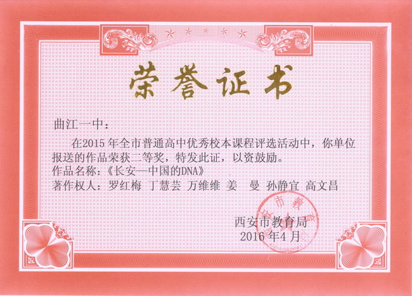 在2015年西安市普通高中优秀校本课程评选活动中历史教研组报送的作品《长安——中国的DNA》荣获二等奖,政治教研组报送的作品《文化·西安符号》荣获三等奖