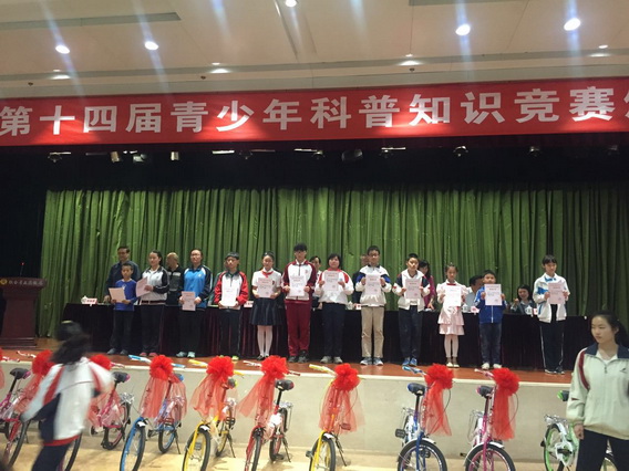 2016年5月20日在止园饭店举行颁奖仪式,市科协副主席李义祥、关工委秘书长呼延巧凤、团市委副书记胡玥、市教育局副巡视员田征出席了本次活动并为代表队颁发证书和奖品。初三三班黄靖雯同学代表我校获奖学生上台领奖。