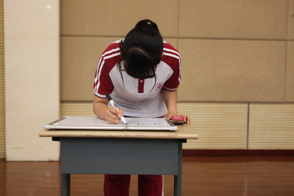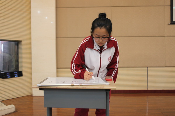 随着比赛接近尾声,最精彩也最激烈的环节“诗海拾珠”拉开了帷幕,这一环节为六轮,采取淘汰制,以诗句接龙的方式进行,只有最后留在场上的三位选手才可以为自己的班级加分。各班纷纷派出了“最强阵容”应战。在短短三十秒的准备时间里,选手们充分调动知识积累,冷静应对“变幻莫测”的题目。比的是能力,拼的是心态。选手们的表现也可圈可点,临危不惧,提笔上阵,穿梭于诗海词林,颇具大将风范。