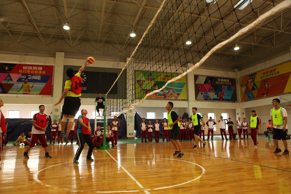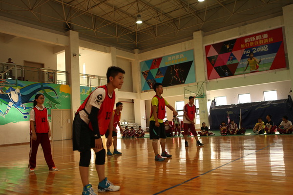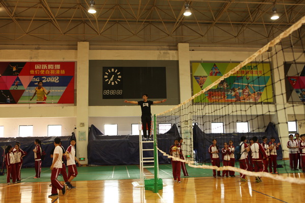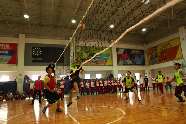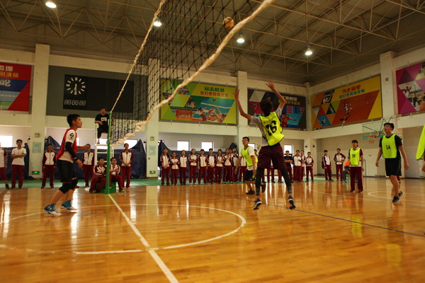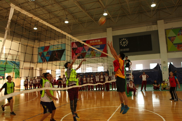 还未开赛,赛场上就已人头攒动,同学和老师们聚集在赛场周围翘首以待这一场精彩赛事的开始,随着一声哨响,各班的队员们便开始了龙争虎斗。一个个精彩的拦网、扣球,团队间一个又一个完美的配合都让观战的同学们欢呼不已。落后的队伍也毫不逊色,不断地调整自己的战略战术,为了搬回比分显示出了他们永不放弃的精神。此时,场下的拉拉队也喊破了嗓子为自己的班级加油助威,好一派热闹的场景。