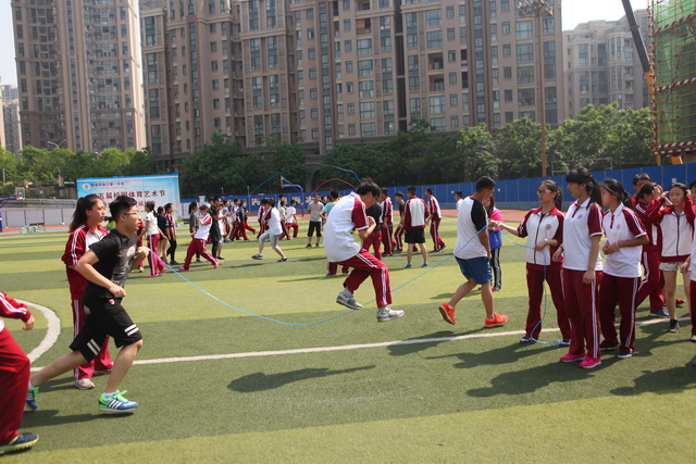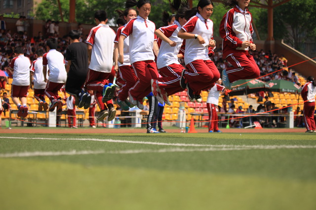 在此之前,各班有条不紊地进行了“同跳一根绳”和“绕八字竞速”比赛。随着裁判的哨音响起,赛场上的同学们和着整齐的节拍,在上下翻飞的跳绳中快速地跳起、落下,那姿态似雄鹰展翅,轻如飞燕。比赛中,各班同学全力以赴,配合默契,充分彰显了集体的力量。