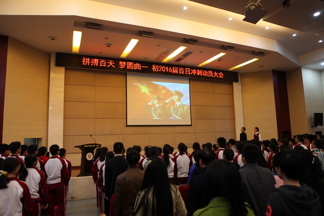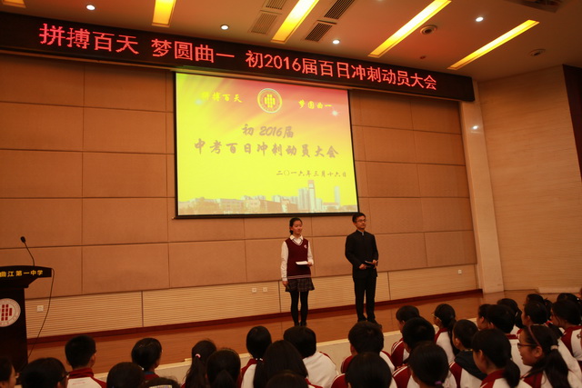 “曲江水满花千树,春风不言润桃李”。为了坚定初三学子迎战中考的信心,激发拼搏奋斗的精神,以良好心态投入到紧张备考中,3月16日下午,我校初2016届全体同学在曲江一中报告厅参加了中考百日冲刺动员大会。常务副校长陈勇刚、副校长曹琦、政教处主任余爱东、政教处副主任刘瑜、初2016届全体师生及家长代表参加了本次大会。大会由高文昌老师和陈昳冰同学主持。