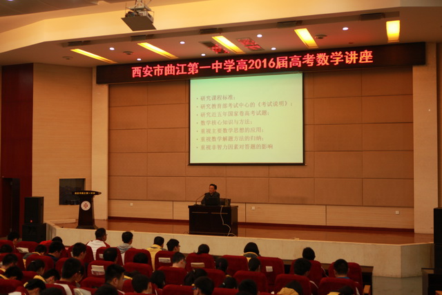 3月17日,西安市曲江第一中学特邀请陕西师范大学附属中学特级教师、国家骨干教师、教研室主任何喜安老师在报告厅做《2016年高考数学复习建议》的讲座。2016届高三全体学生及教师参加,会议由西安市曲江一中教务处副主任高秋棉老师主持。现场气氛热烈。