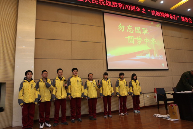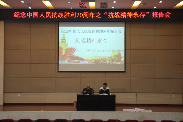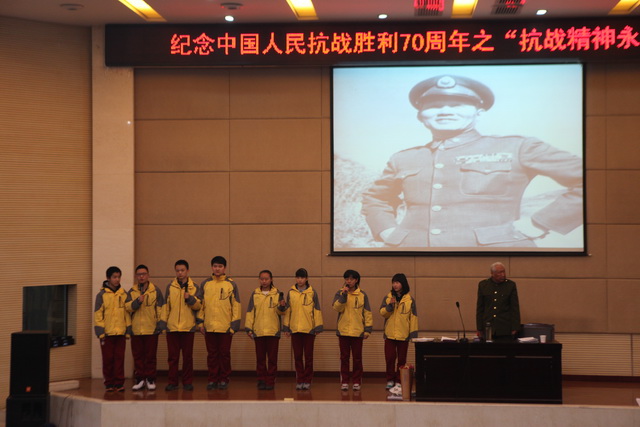 今年是中国人民抗日战争暨世界反法西斯战争胜利70周年,为纪念英雄的丰功伟绩,激励青少年健康成长,我校有幸请到了抗战老战士,陕西师范大学杨清源教授于12月23日下午在报告厅作“抗战精神永存”主题讲座,初2017级300多名同学聆听了本次讲座。