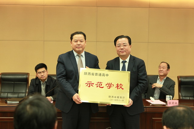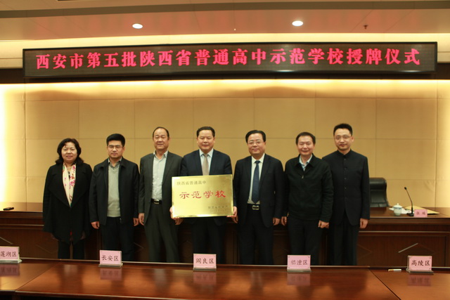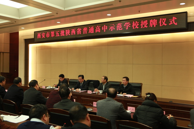 2015年12月29日下午,西安市第五批陕西省普通高中示范学校授牌仪式在西安市政府第二会议室举行。陕西省教育厅副厅长王海波、陕西省基础教育二处处长张荣祖、西安市教育局副局长赵春平、西安市教育局副局长张瑞及西安市各区县教育局局长和标准化高中校长出席。