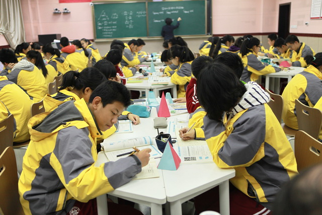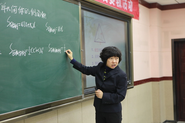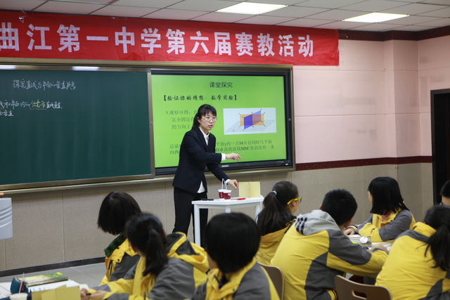赛教前,四位参赛数学教师吴晴雯、廖益贵、郭亚菊、马博厂认真钻研教材,反复推敲教学内容,精心设计教学环节。课堂上,教师们运用丰富多样的教学手段,用心制作的精美课件,设计新颖的教学活动,充分调动了学生的积极性。吴老师的课《探究直线与平面的垂直关系》重点突出了判定定理的教与学,从到“这条直线可以垂直于平面内任意一条直线” 到“从一条直线垂直于平面上两条相交直线”这个难点的突破,师生经历了有意义的探究活动。利用纸杯模型,以及两个硬板试验中平移和旋转,较好地帮助学生突破了难点,使问题化难为易。另外对例题的处理有教师的创新之处,由简单图形到复杂图形,遵循学生认知规律。整堂课,教师本着“让学生充分经历知识的形成、发展和应用过程” 的教学理念,将教材中静态的数学知识还原成动态的生成过程,尽可能地为学生提供一种思考、交流、探究的空间,为促进学生在教师指导下主动地、富有个性地学习而教。廖老师的课《导数的几何意义》,围绕“利用函数图象直观理解、探究导数的几何意义”和“利用导数的几何意义解释实际问题”两个重心开展教学,以“问题串”引导学生学习,教学中使用多媒体辅助教学,动态展示割线逼近切线的过程,让学生从不同角度体验导数与切线斜率的辩证关系。重视概念的深度剖析,关注数学思想的渗透。 郭老师的课《简单几何体的侧面积》,以转化的数学思想为主线,以简单几何体的侧面积为载体,通过几何模型展示、多媒体辅助的形式,将课堂内容进行生动的剖析,在教学过程中,学生积极思考、动手实践、合作交流、展示成果,真正的贯彻了以学生为主体,教师为主导的新课改理念。马老师的课《反证法》,紧抓基本概念与基本技能,采用“解题教学法”提高学生的数学素质,培养学生从不同教学思考问题,解决实际问题的能力,在教学过程中融入数学史,将数学看成一种文化,提升学生对数学发展、数学文化的了解,通过数学教学达到育人的目的。赛教教师的每节课都体现了自己独特的教学风格,活跃课堂气氛的同时,将知识点自然融入到课堂分分秒秒中,让学生主动学习知识,为上课学生和听课的教师呈现精彩的内容。