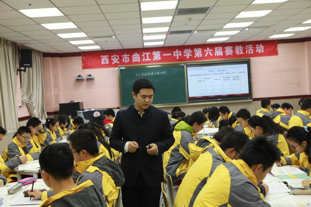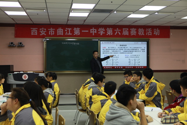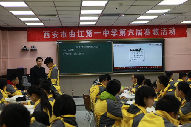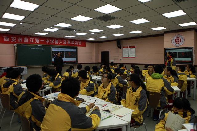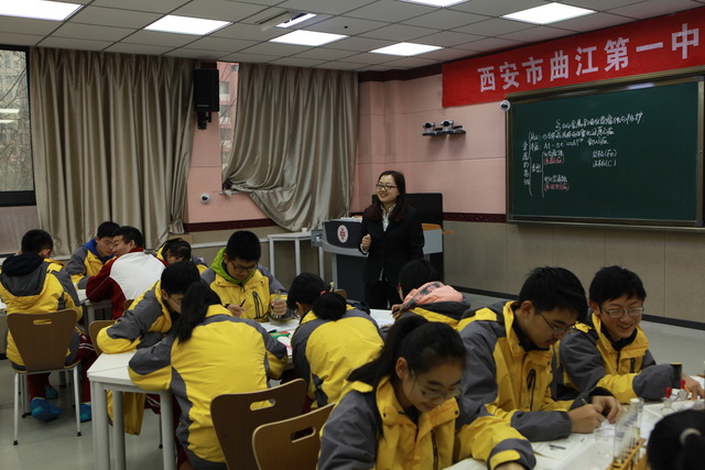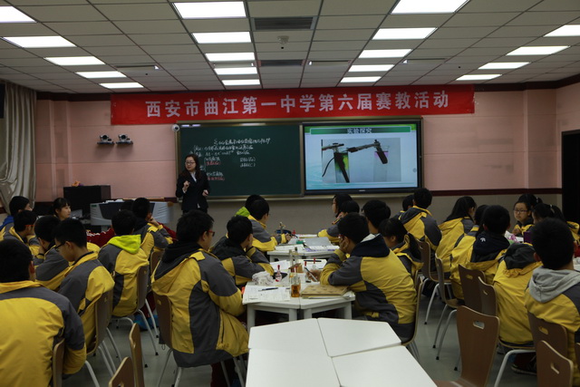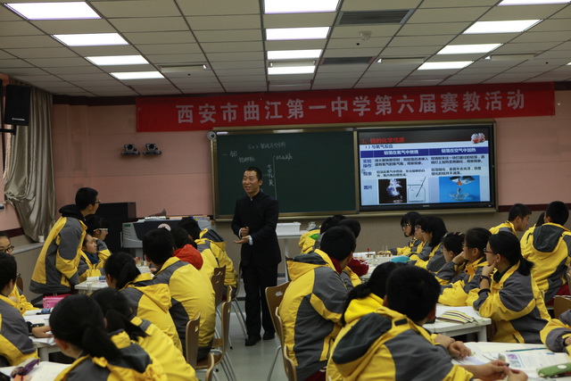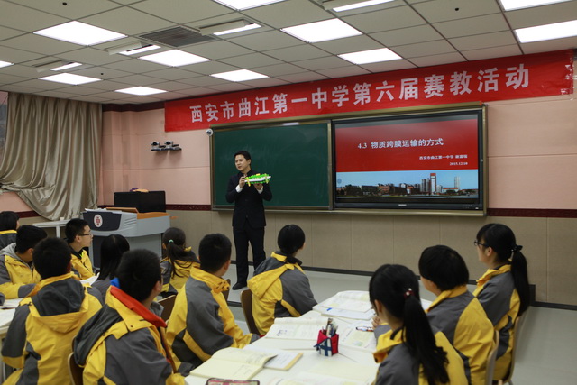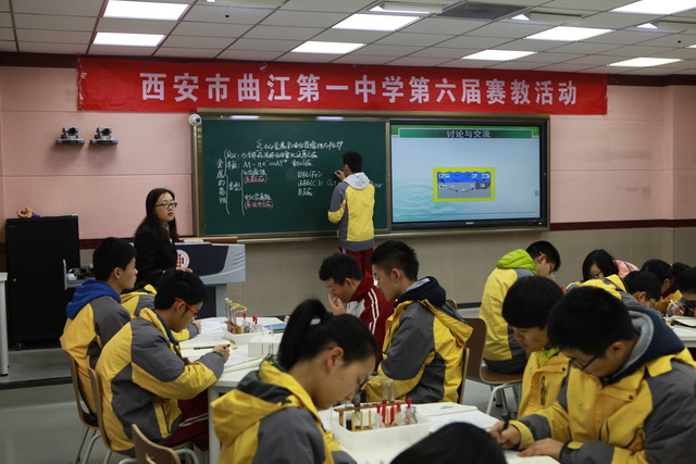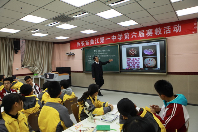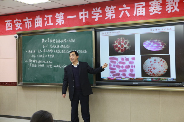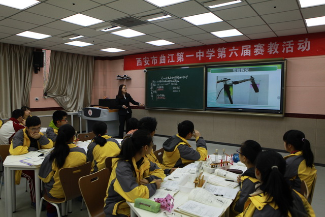 2015年12月9日,曲江一中第六届赛教活动(高中组)进入到了第四天。今天上场的是理综组的六位老师。比赛特邀陕西师范大学生物学课程与教学论李高峰教授,雁塔区教师进修学校物理学科赵万教研员、化学学科马鑫教研员和生物学科韩红艳研究员,陕西师范大学附属中学原化学教研组长刘孝元老师,以及西安市曲江第一中学理综教研组组长赵常斌老师担任评委。来自后柳中学、西安市第四十五中的部分老师,及我校的全体理科教师观摩了这次比赛。