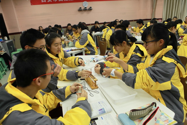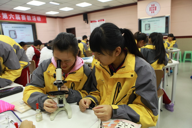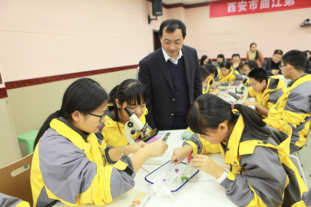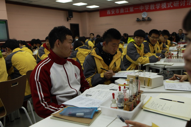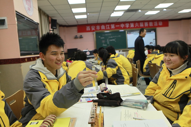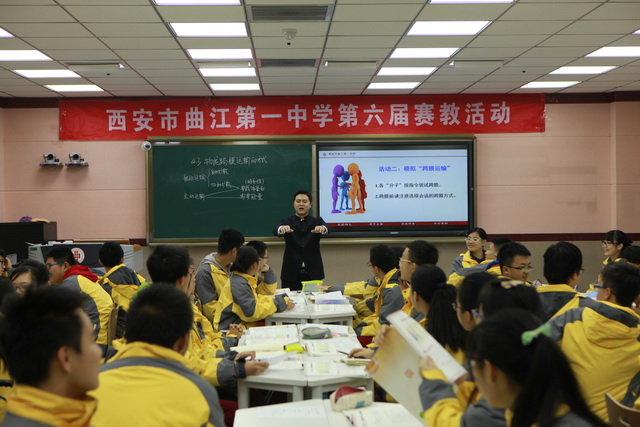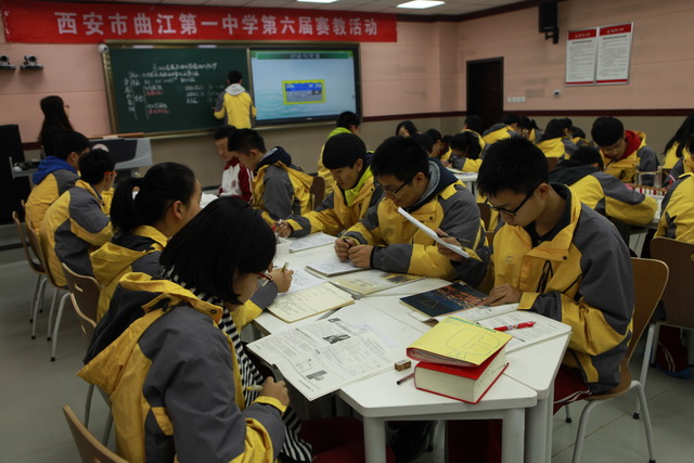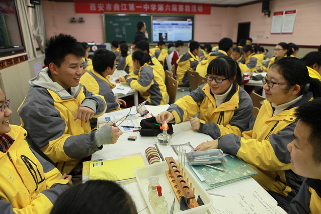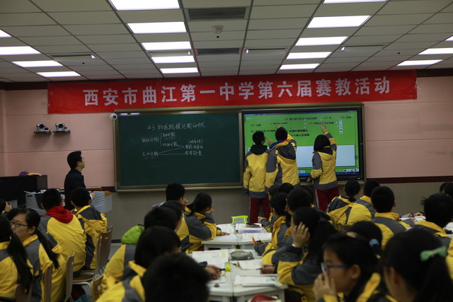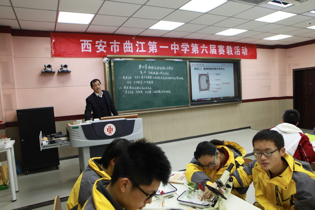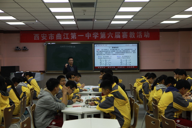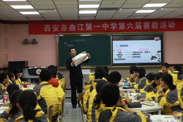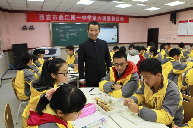 2015年12月9日,曲江一中第六届赛教活动(高中组)进入到了第四天。今天上场的是理综组的六位老师。比赛特邀陕西师范大学生物学课程与教学论李高峰教授,雁塔区教师进修学校物理学科赵万教研员、化学学科马鑫教研员和生物学科韩红艳研究员,陕西师范大学附属中学原化学教研组长刘孝元老师,以及西安市曲江第一中学理综教研组组长赵常斌老师担任评委。来自后柳中学、西安市第四十五中的部分老师,及我校的全体理科教师观摩了这次比赛。