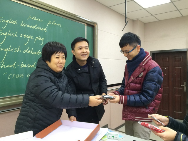 会议在张老师全英文的开场词中开始。张老师首先对参加赛教的十二位老师表示了祝贺,并感谢组内老师的辛勤付出和帮助。赛教不仅是个人教学的展示,也是整个教研组的共同付出和荣誉的体现。在享受喜悦的同时也要总结得失,相互探讨学习。取他家之彩,润自家之色。随后,朱主任和张老师向赛教老师赠送手套,肯定努力,传递暖意。