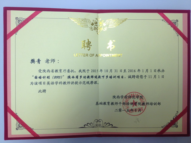 11月1日,我校英语教研组樊青老师代表我校参加了在韩城市举办的“国培计划(2015)”陕西省送教下乡培训项目,并在韩城市新城二中为参加该项目的所有初中英语教师讲授了一节示范观摩课。