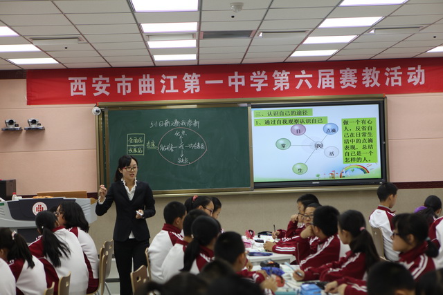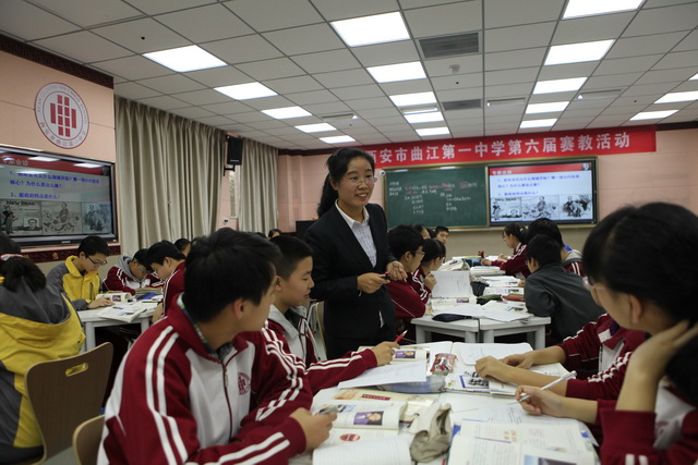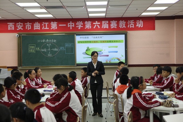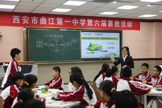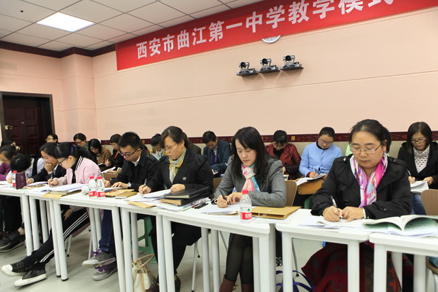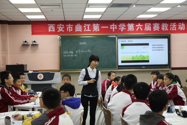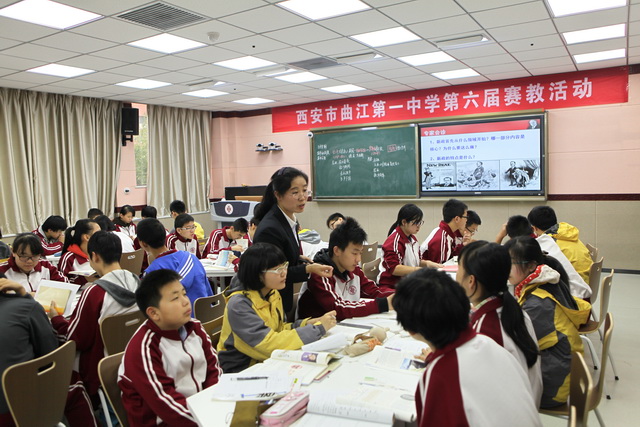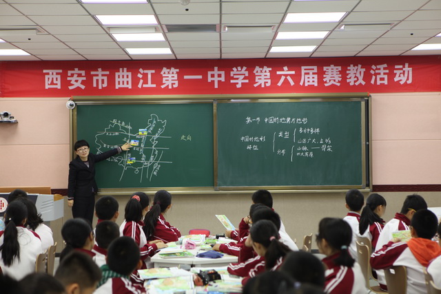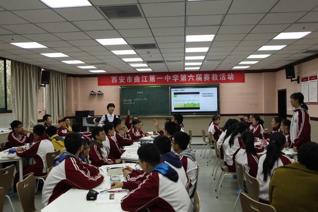 2015年10月30日,曲江一中第六届赛教活动进入到了最后一天的角逐,今天比赛的主角是文综组的四位老师,比赛特邀雁塔区教研员赵晓绒,雁塔区教教研员高秀梅,西安市曲江第一中学政教处主任余爱东以及西安市曲江第一中学文综组教研组长罗红梅担任评委。来自石泉县城关中学、西安市第四十五中的部分老师,及我校的全体文综组教师观摩了这次比赛。