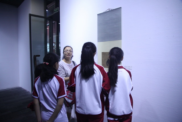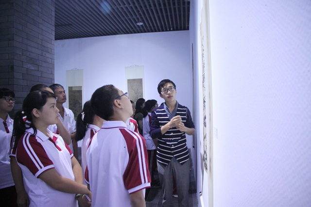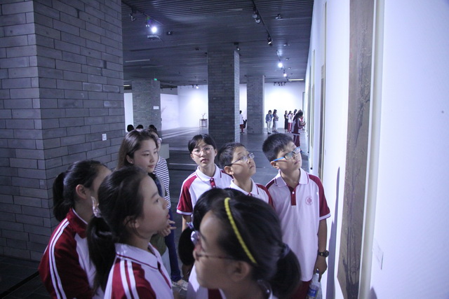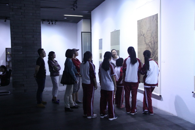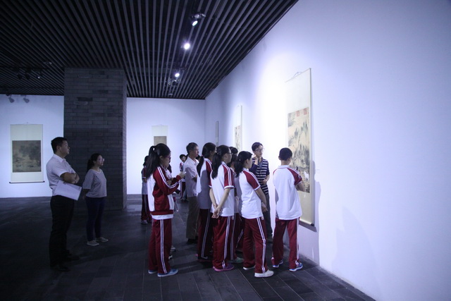 西安美术馆公共教育部高老师和尚老师为学上简单讲解本次展览后,学生分批由志愿者引导观看画作。首先,志愿者将学生带到韩干的《牧马图》前,这幅画生动地表现了骏马的体态神情,准确、简炼,真实。《牧马图》描绘骏马肥硕雄骏马的英姿。紧接着,一幅幅精美形象的工笔绘画以及书法作品展现在学生的眼前,引得学生仔细观看认真思考。