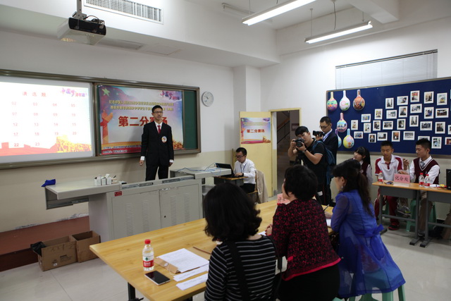 我校高2016届秦晨、屈鑫雨同学高2014届李金录、尹骋昊同学担任比赛的主持人,众多同学也积极参加了本次活动,并担当志愿者。比赛分为初赛和决赛两个阶段,本次预赛分4个分赛场同时进行,由限时自主选题演讲和即兴演讲两个环节组成。最终将有14名老师、14名学生进入决赛。各位参赛选手结合比赛主题,分别从不同的角度,深刻阐释了“铭记历史 缅怀先烈 珍爱和平 开创未来”的精神主旨,用慷慨激昂的语言,赞美了中国人民前赴后继、不屈不挠反抗侵略的英雄事迹,歌颂了中国共产党在全民族团结抗战中的中流砥柱作用和丰功伟绩,大力弘扬了抗日战争中孕育出的伟大民族精神。他们声情并茂的演讲,富有深度的见解,给在场的观众和评委留下了深刻的印象。乔亚龙老师代表我校青年教师参加了此次比赛。他激情澎湃的演讲赢得了大家的阵阵掌声。