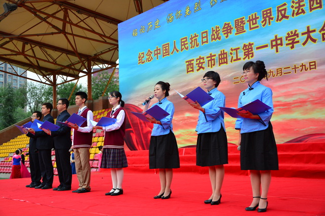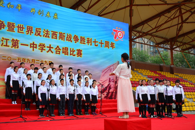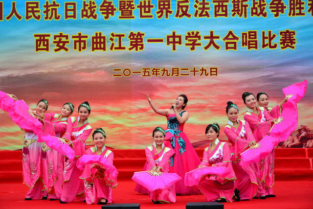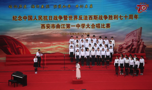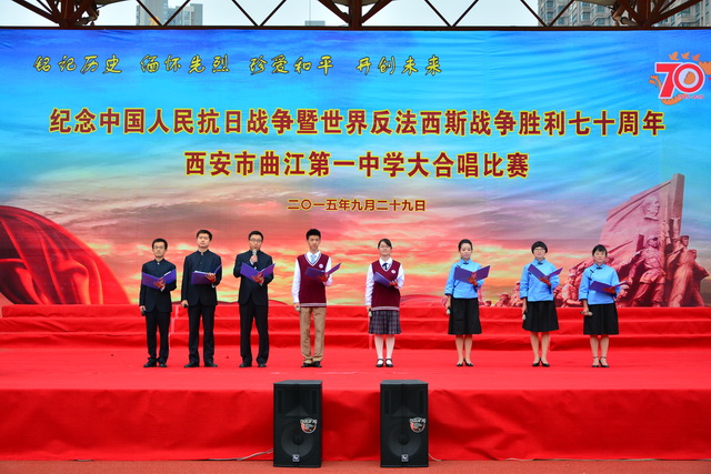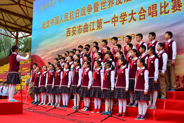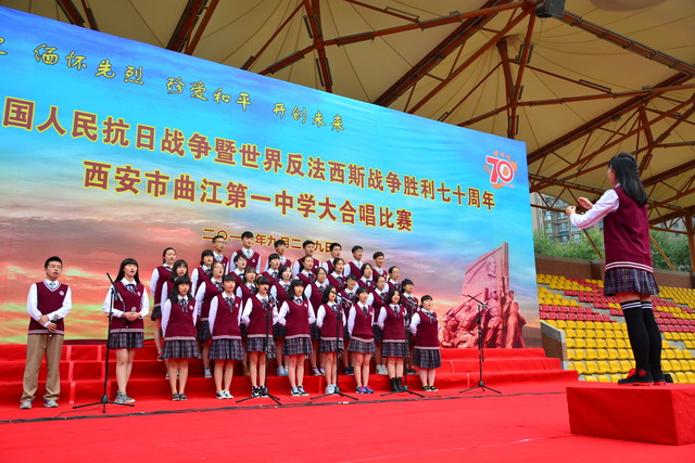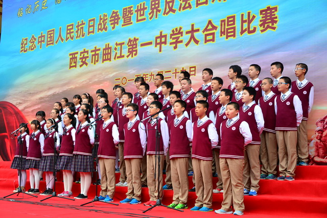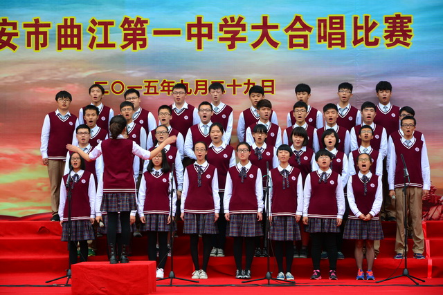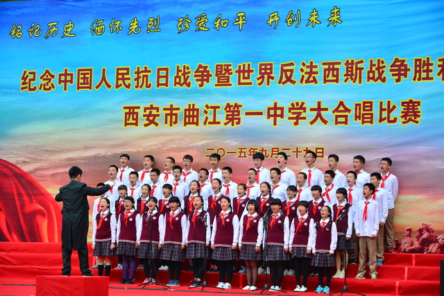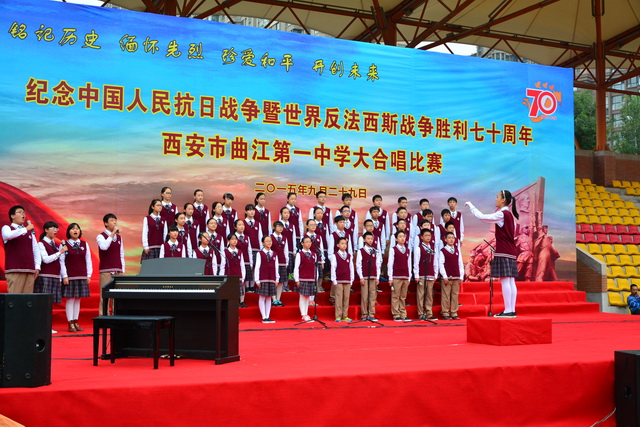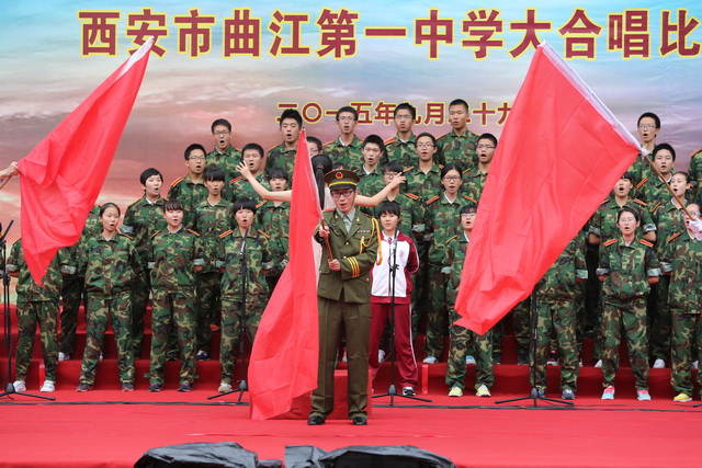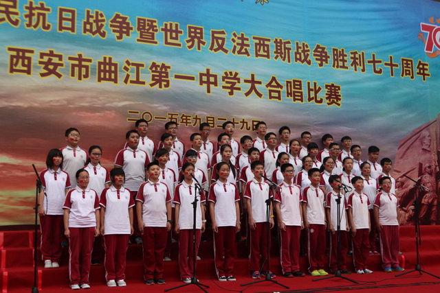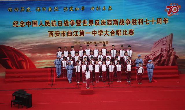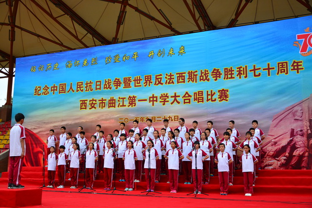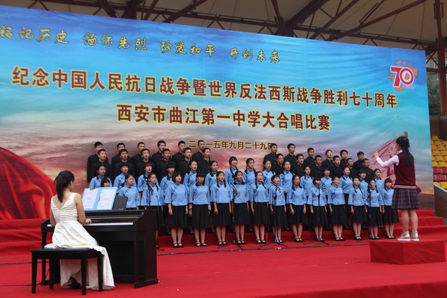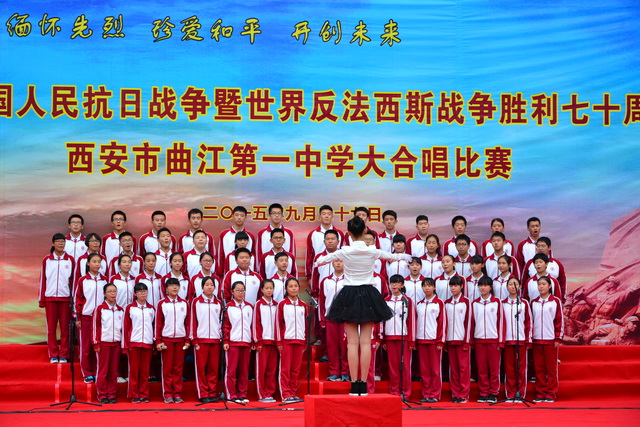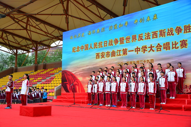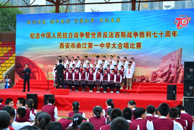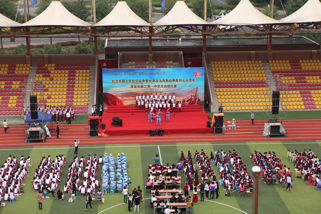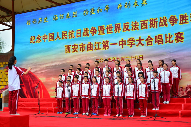 2015年是世界反法西斯战争胜利暨中国人民抗日战争胜利70周年,为弘扬以爱国主义为核心的民族精神,传承绵延五千年复兴民族的中国梦。2015年9月29日下午,在国庆66周年来临前夕,曲江一中在校操场举行了“迎国庆向国旗献礼”暨纪念中国人民抗日战争世界反法西斯战争胜利七十周年大合唱比赛。