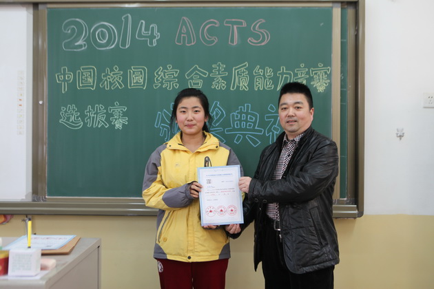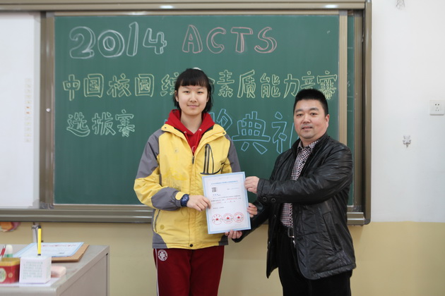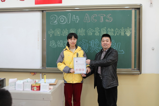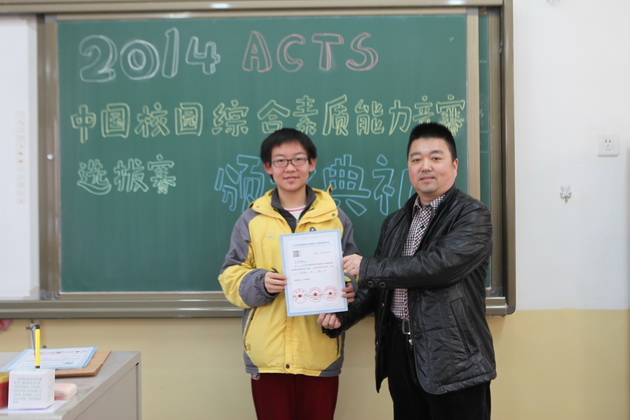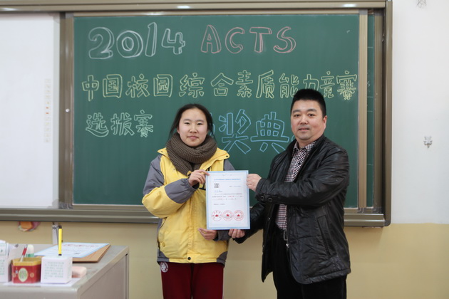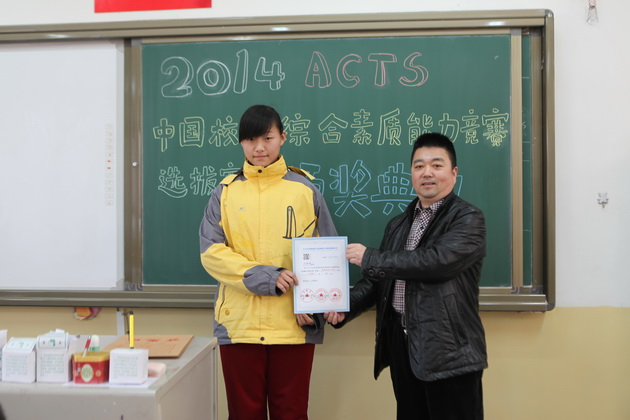 李老师为九年级获奖学生颁发ACTS证书