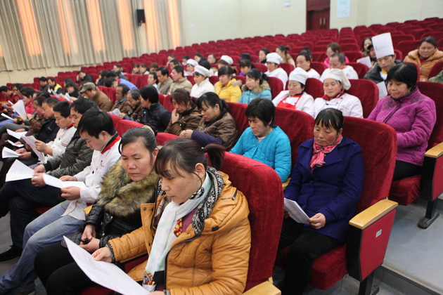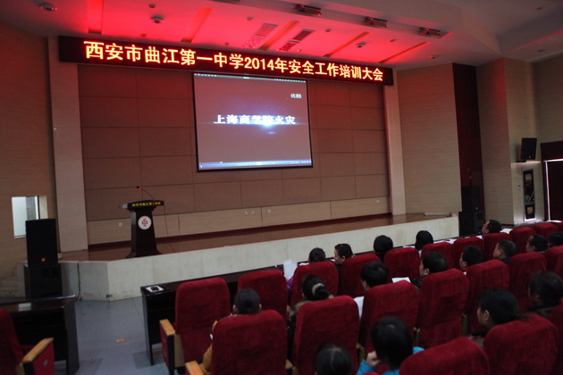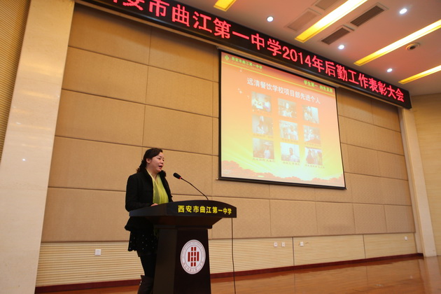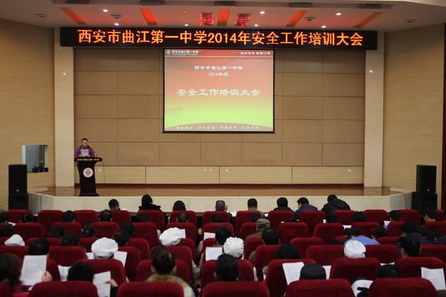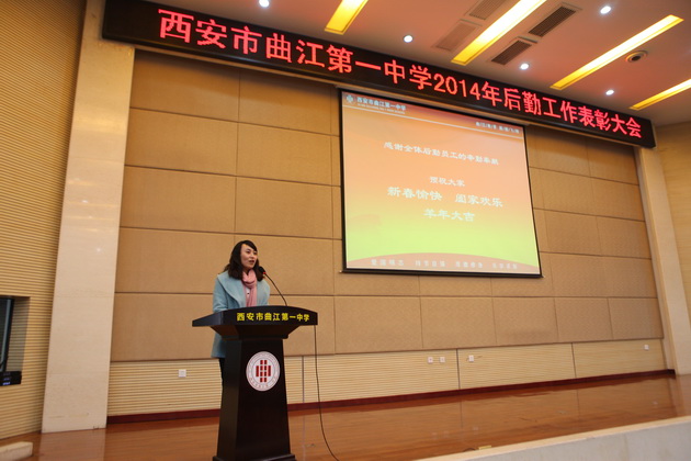 2月10日14时30分,本次大会在曲江一中报告厅如期召开,曲江一中副校长曹琦、总务处主任王锦、圣境物业副总经理李娜、远清餐饮项目经理曾英、利笙车辆总经理苗壮出席了本次会议。首先,曲江一中总务处主任王锦就2014年校园安全工作进行了总结。王主任表示,2014年是不平凡的一年,全国各地的安全事故层出不穷,这给学校的安全工作带来巨大压力。但曲江一中在上级单位的领导下,始终坚持预防为主的工作方针,积极落实多项举措,加强保卫、综合治理,排查解决各类隐患,先后取得了西安市平安校园、西安市文明交通示范学校、曲江新区安全生产及消防安全先进单位等多项荣誉,可谓成绩喜人。但更好的成绩将会对未来工作提出更高的要求,王主任鼓舞全体后勤人员在来年的工作中,主动学习、提高效率,争取为校园安全做出更大的贡献。
