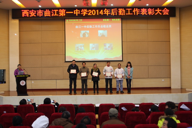 15点30分,本次大会进行了第三项内容——后勤工作表彰大会。此项内容是在曹校长的建议下,特别嘉奖奋战在后勤服务工作一线的基层员工。首先,在工作人员的安排下,曹校长分别为各单位先进个人进行了表彰,获奖人是由各单位员工选举产生,旨在嘉奖那些在2014年工作中表现突出的员工。随后,曹校长为特别设立的乐业敬业奖的员工进行了表彰,该奖项是在曹校长的建议下,特别嘉奖在曲江一中服务超过四年的员工,特别感谢他们几年来如一日的坚持与付出。