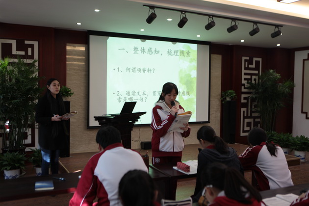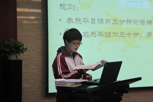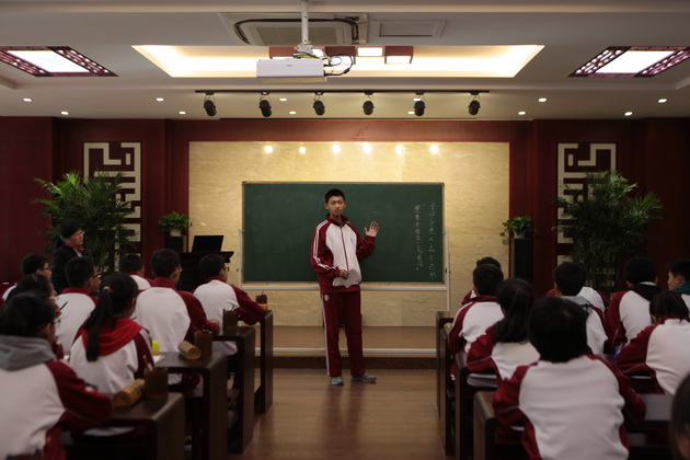 本次观摩活动在高一年级苏岳老师的“《论语》阅读挑战赛”中徐徐拉开帷幕。苏老师通过“杏坛之声”、“金声玉振”、“两家争鸣”等环节的精巧设计,将学生的思维和情感引领至如诗如画的唯美境界,让高2017届3班与高2017届4班两班同学在比赛中感受《论语》魅力,在翻译国学章句中修身养性、顿悟人生真谛,在集体荣誉感中收获《论语》智慧。苏老师以学生平时国学经典的阅读为基础,大胆突破,变教师课堂为学生课堂,引导学生大胆领悟经典文本,充分激发学生的热情。