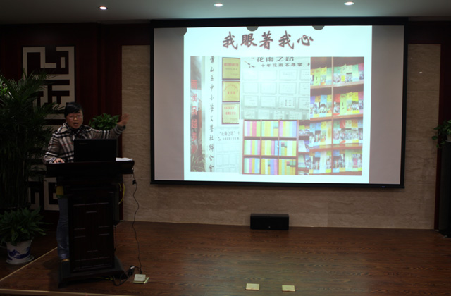 第三位分享的是金慧老师。十一月上旬,金慧老师和陈金叶老师赴杭州萧山十中参加了第四届全国校园文学研究高峰论坛。金老师以丰富的图片和风趣的语言为大家讲述了参加此次活动的真切感受。她一方面分享了大会关于校园文学融入语文课堂的理念,一方面展示了萧山十中丰富多样的校园文化。同时,她对我校的文学社团、文学刊物、研究性学习等方面提出了富有建设性的意见。