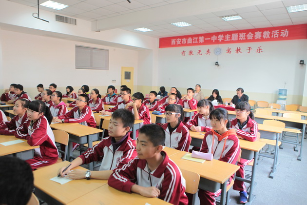 2014年10月16日至10月17日,我校在录课教室举行了主题班会赛教活动。这次活动以社会主义核心价值观24字方针为主题,旨在进一步加强学生对其的理解和实践。本次活动特邀陕师大附中副校长张帆、政教处主任邓小鹰、专业心理学教师岑坚、学校办公室兼政教处主任余爱东、政教处副主任刘瑜担任评委。初中六位班主任、高中四位班主任分别从不同角度给学生上了一堂生动的公民教育课。