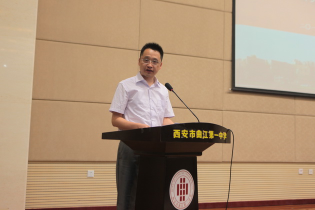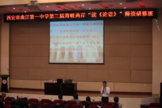 2014年7月6日上午8点30分,由我校承办的第三届海峡两岸“读《论语》”师资研修班在曲江一中报告厅拉开帷幕。本次研修班主讲嘉宾为台北市立松山高中国文老师刘桂光博士、台北市私立达人女中国文教师周薆玫老师。来自曲江一中、陕师大附中等学校的200余名教师参加了此次培训活动。