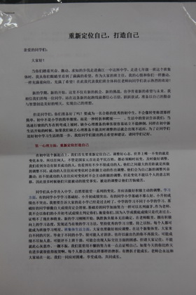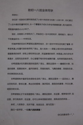 如何让刚步入中学的小学毕业生快速适应初中新生活、新老师、新环境?这成为初2017届班主任开学的首要问题。在讯拍中,我们无意中发现张贴在班级名片牌上的《致X班的全体同学》这样的信件,字里行间流露着初2017届班主任老师对新同学的关注、爱护、希望和无限的关怀……