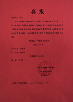 在曲江一中师生的辛勤付出、共同努力下,我校在第二十五届“希望杯”全国数学邀请赛中取得了优异的成绩。希望获奖同学、老师能再接再厉,更进一步,再创我校数学教育新辉煌。
