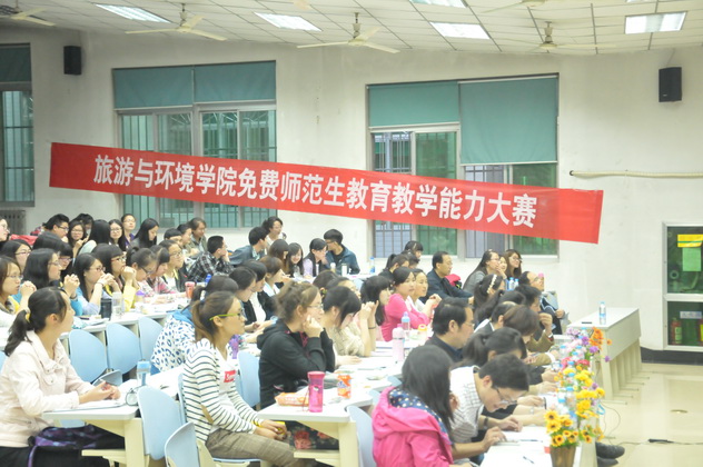 4月29日晚,陕西师范大学旅游与环境学院第五届免费师范生教育教学能力大赛决赛在长安校区文渊楼101教室举行。党委书记刘少锋、副院长李铁绳,学院教师白文新副教授、户清丽副教授、陈林老师和一线中学教师西安高新一中张香老师、西安曲江一中王莉老师、西安铁一中谷海宇老师、西安长安一中李斌老师、西安第30中学白君丽老师参加了本次比赛并担任本次比赛评委。学院团委书记、2011级、2012级旅游管理专业本科生辅导员郝高建、2010级本科生辅导员朱冰冰老师,教学秘书王钰以及2011级全体免费师范生参加了本次比赛。