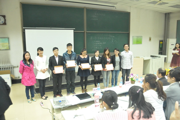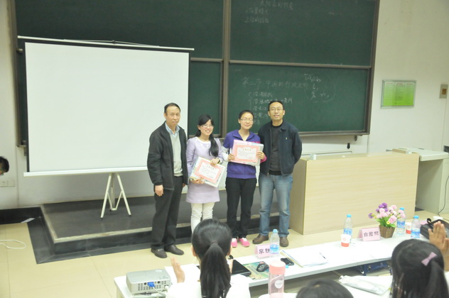 为了切实提高免费师范生的教学技能,学院给每个免费师范生宿舍配备了小黑板,让学生练习粉笔字,以提高学生的板书水平;将2011级141名免费师范生以5-6人为单位进行分组,每组都配有教学经验丰富的老师予以指导,分别从教学设计、课堂导入、说课、讲课、多媒体课件制作等各个环节对学生进行专门培训,经层层选拔最终确定了10名学生参加决赛。决赛包括即兴演讲;模拟授课;现场回答评委提问三个环节,总共持续了三个小时。最终,经过激烈角逐,2011级地理科学3班的唐荣和地理科学1班的蔡燕娜获得一等奖。各位领导和老师分别为获奖选手颁发了获奖证书和奖品。