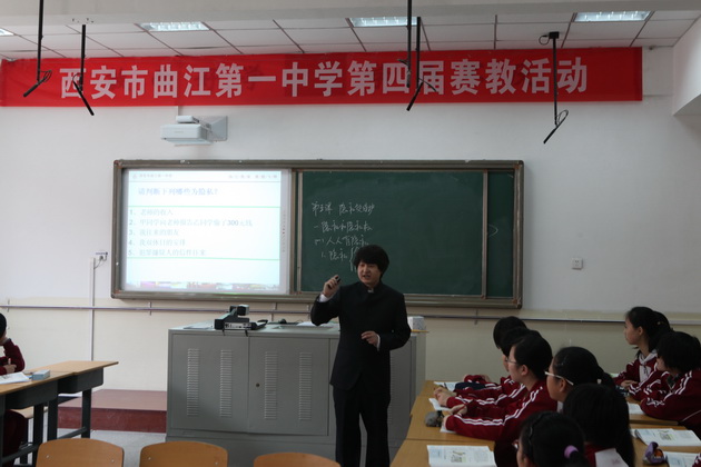 2014年3月24日—3月26日、3月28日—4月1日,我校在录课教室分别举行了第四届赛教活动初中理科、初中文科组教师的赛教活动。本次赛教活动特邀陕西师范大学专家、雁塔区教研员、陕师大附中各学科带头人担任评委,共有语、数、英等12门学科23位教师参加比赛。我校常务副校长陈勇刚、副校长曹琦、学校办公室兼政教处主任余爱东、教务处主任朱琳瑛、教务处副主任高秋棉、教研室副主任刘公潜、各年级组长、各教研组长及各学科教师观摩了这次比赛。