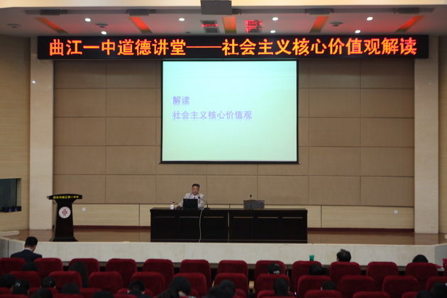 为了弘扬社会主义核心价值观,全面提升全体教职工的道德素质,围绕第十三个公民道德建设月主题,4月16日,日下午,一场以“社会主义核心价值观”为主题的道德讲堂在曲江一中正式开讲。