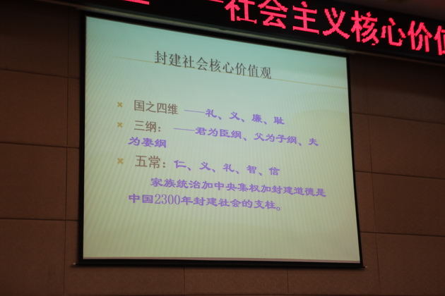 此次道德讲堂我校特别邀请陕西师范大学政治学郭欣根教授为全体教职工解读“社会主义核心价值观”。郭教授从封建社会的“三纲”“五常”讲起,逐步分析了目前“核心价值观”的先进性所在。随后为大家详细讲解了“社会主义核心价值观”的三个层次:党的十八大报告用24个字提出覆盖全国各方面意见、反映现阶段全国人民最大公约数的社会主义核心价值观的表述。这个表述是分别从国家、社会、个人三个层面进行的。从国家层面看,是富强、民主、文明、和谐;从社会层面看,是自由、平等、公正、法治;从公民个人层面看,是爱国、敬业、诚信、友善。从而深入讲解。郭教授引导各位教职工结合教师职业特点,从爱国守法、爱岗敬业、关爱学生、教书育人、为人师表等方面探索和思考我们如何积极推进社会主义核心价值观的建设、实践社会主义核心价值观。