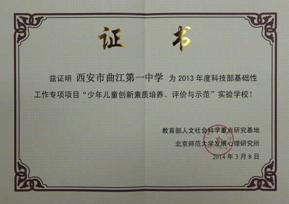 西安市曲江第一中学跻身“少年儿童创新素质培养、评价与示范”实验学校