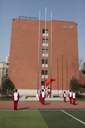 早晨9:50,升旗仪式准时开始。在庄严的国歌声中,五星红旗冉冉升起。