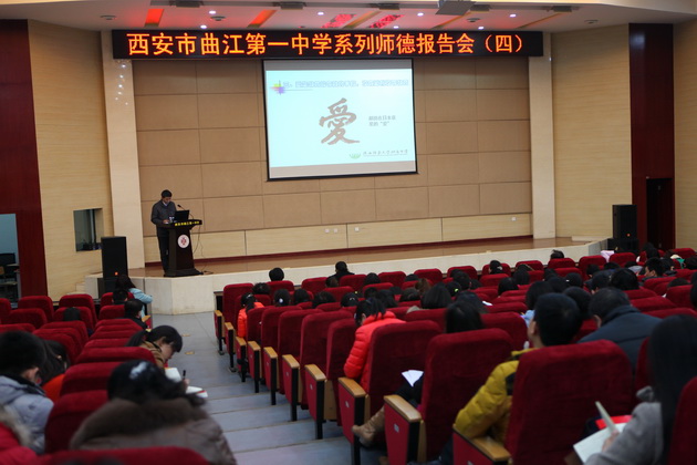 2014年2月26日17时,,陕西师范大学附属中学王中仁老师应曲江一中常务副校长陈勇刚邀请,为曲江一中全体教职工做了题为“爱的教育”主题报告会。曲江一中常务副校长陈勇刚、副校长曹琦、学校办公室兼政教处主任余爱东等领导出席了本次报告会。报告会由常务副校长陈勇刚主持,他对王老师的情况进行了简单介绍。在热烈的掌声中,王老师迈着轻快的脚步走上主席台,为大家讲述自己教书育人的真实故事。