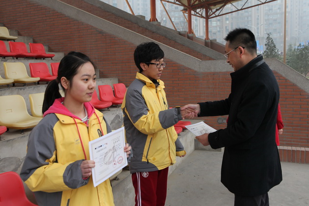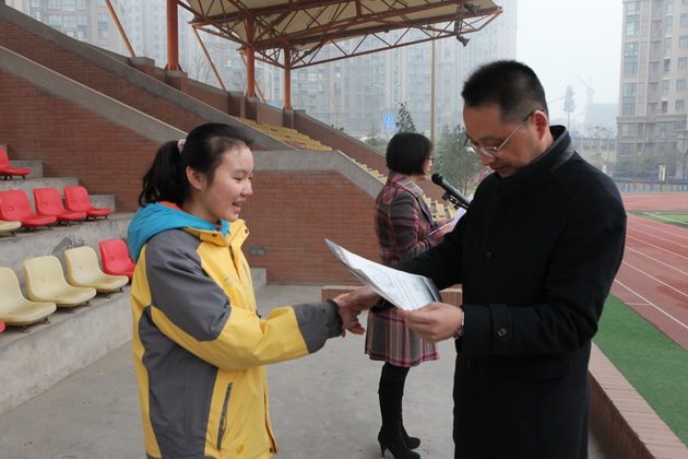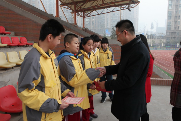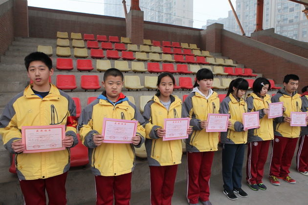 早晨9:50,升旗仪式准时开始。国旗护卫队迈着整齐的步伐走向旗台,在庄严的国歌声中,五星红旗冉冉升起。初二八班梁景媛同学作了题为《弘扬雷锋精神》的国旗下讲话,倡导大家学习雷锋无私奉献的精神。大会第二项,由学生会纪检部部长毕雪儿同学宣读学校禁烟倡议书,刘主任宣布曲江一中中学生禁烟制度。初二九班边怡雯同学宣读了值周总结。学生会纪检部秦晨同学宣读了上周学校文明礼仪检查情况。刘瑜老师宣读了上周宿舍检查结果。 最后学校常务副校长陈勇刚为我校获得西安市第十届校际模拟联合国会议最具潜力奖的向婧妍同学和2013年英语竞赛获奖的学生颁发荣誉证书。