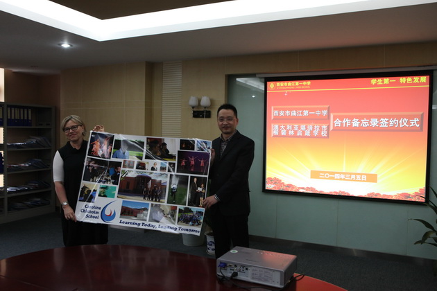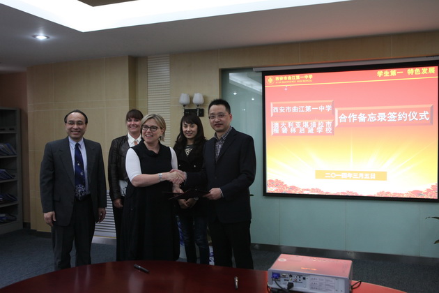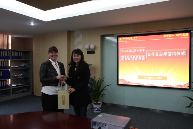我校常务副校长陈勇刚、副校长曹琦参加了签署仪式,仪式开始前,两校校长就中国、澳大利亚两国的中学教育现状以及两校的现有教学情况进行了深入交流,随后,双方签署了西安市曲江第一中学与 澳大利亚堪培拉市楷箬林启箴学校签署合作备忘录,希望能够尽快能将此次的交流意愿达成现实。
