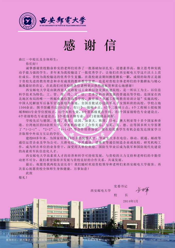 一封来自西安邮电大学的感谢信
