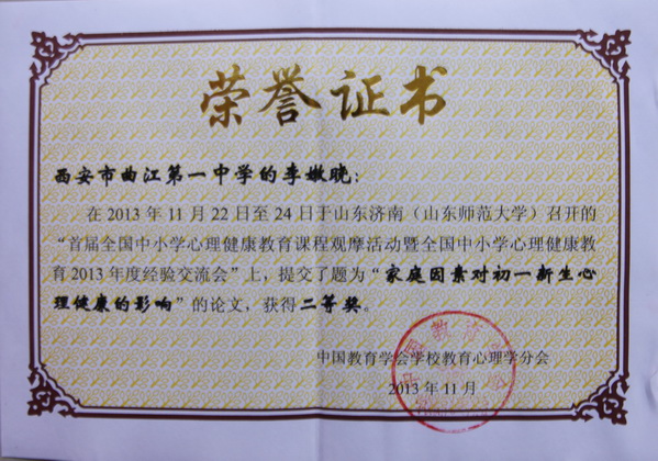 本届大会主题为“中小学心理健康教育:课程推进与实践经验”,会议设立中小学心理健康教育的研究论文交流与实践活动课程观摩分享环节两个环节。在校领导的大力支持下,我校心理教师李嫩晓积极开展实际调查与研究,撰写出一篇题为“家庭因素对初一新生心理健康的影响”的研究论文,我校陈勇刚副校长、陕师大附中岑坚老师及赵千秋老师提出了许多宝贵的意见,李嫩晓老师经过精心修改,最终形成比较完善的论文并提交会议组参评。