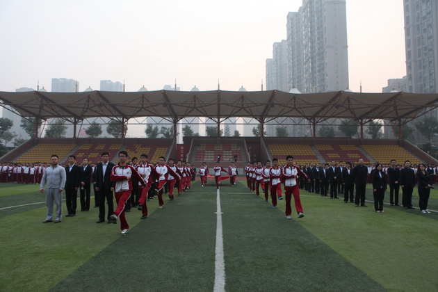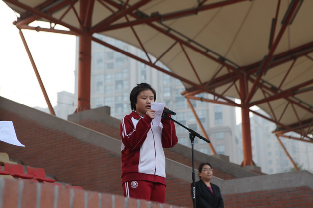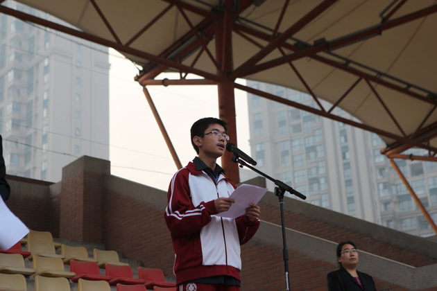 早晨7:40,升旗仪式准时开始。国旗护卫队迈着整齐的步伐走向旗台,在庄严的国歌声中,五星红旗冉冉升起。高一1班周博同学作了题为《勤俭节约,从我做起》的国旗下讲话。高一1班庞欣锐宣读了值周总结。随后,刘瑜老师宣读了上周宿舍检查结果。最后,政教处主任余爱东为我校第二届跑操比赛获奖班级及优秀领操员颁发了奖状及荣誉证书。