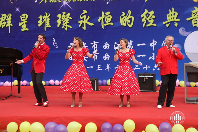 10月26日下午,曲江一中的操场变成了欢乐的海洋。著名钢琴家周晴和格莱美获奖音乐家捷帝·米勒一曲《无法完成的任务》(《Mission Impossible》)拉开了高雅艺术校园献演的序幕。音乐会上,有雅俗共赏的流行音乐《江南Style》,有深情悠扬的《康定情歌》,有原汁原味的美国中西部地区乡村音乐,有家喻户晓的中国经典民曲。一曲终了,令人回味无穷、余音绕梁。