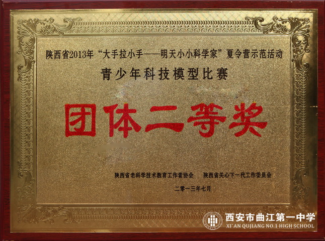 2013年8月31日从陕西省老科学技术教育工作者协会和陕西省关心下一代工作委员会获悉,陕西省2013年“大手拉小手——明天小小科学家”夏令营示范活动青少年科技模型比赛结果揭晓,曲江一中何沛泽、李宜锋等9名同学荣登光荣榜,我校荣获“团体二等奖”。