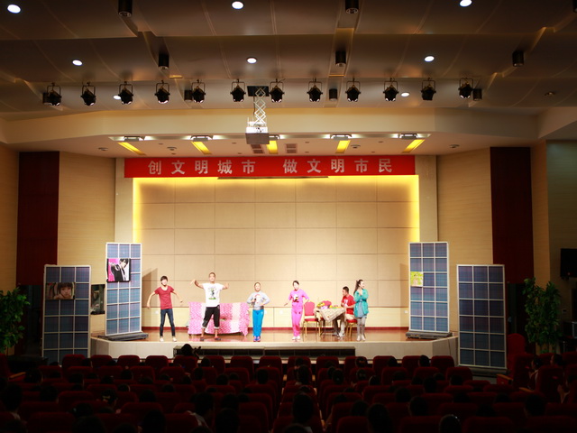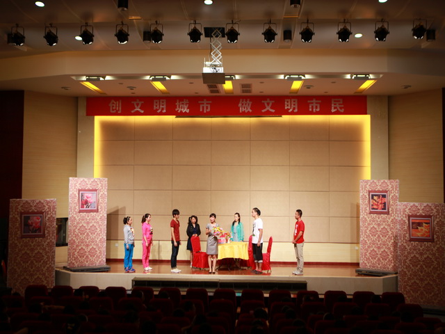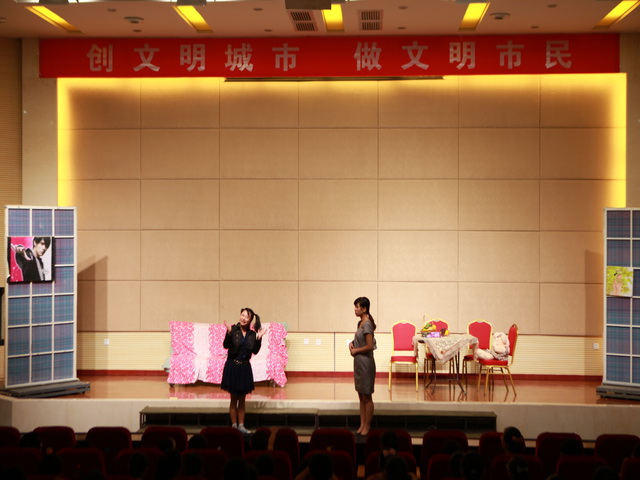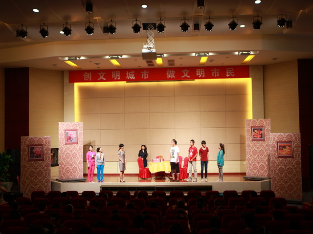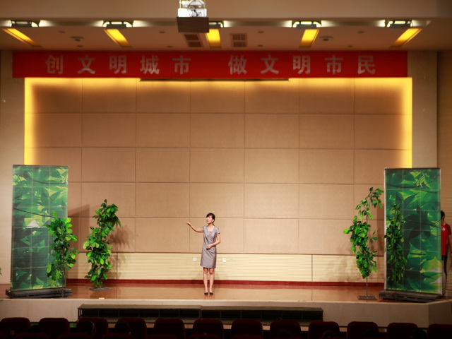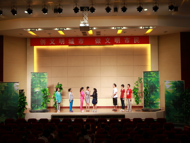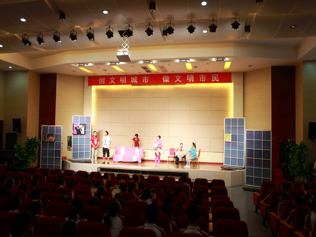 经过工作人员紧锣密鼓的布置,报告厅已由原来的庄严肃穆变得活泼生动,舞台上方“创文明城市,做文明市民”的横幅更是熠熠生辉。有序入场的同学和老师们对此次表演都充满了期待。
