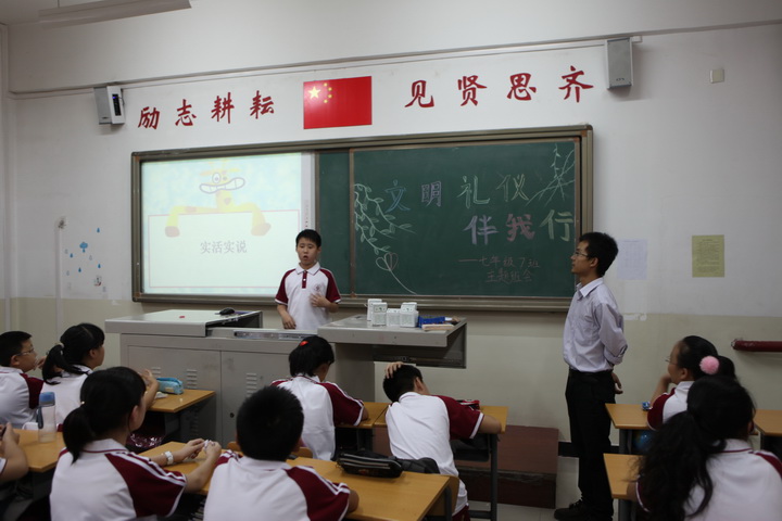 为了提高我校学生讲文明、知礼仪的行为规范,给全校营造一个良好的学习与生活环境,促进学生在德、智、体、美、劳等方面全面发展,2013年9月4日下午,我校举行了以“文明礼仪与校风校纪”为主题的班会。