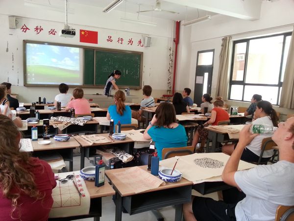 我校的汉语课堂,尤其是针对汉语属于音意文字的特点,给NSLI-Y学生开设层级递进式的汉语课程:汉字基础课---展示中国文字从象形到楷书的演变,让外国学生感受中国“方块字”的魅力;听说能力课---提高学生汉语的语用能力及交际能力,得体恰当地运用汉语;阅读写作课---引领中国学生进入神奇的汉语世界,体验中国散文、小说的无穷魅力;中国传统文化课程---让美国学生研磨运笔,用毛笔书写汉字,临摹绘画竹子,使其更加领略到中国博大精深的璀璨文化。