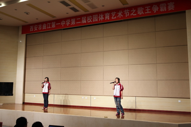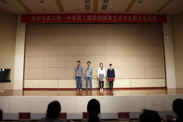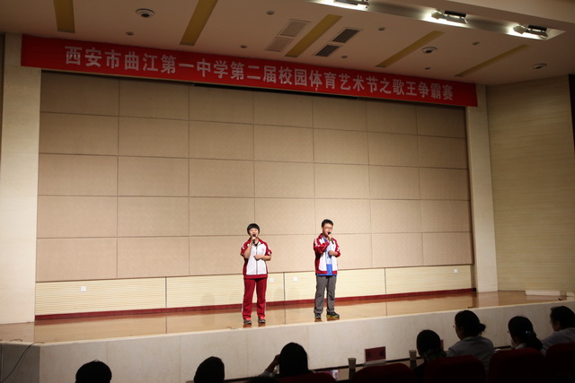 2013年5月29日下午,在报告厅成功举办西安市曲江第一中学第二届校园体育艺术节之高中组歌王争霸赛活动。学校办公室兼政教处主任余爱东、教研室副主任兼高一年级组长刘公潜、高二年级组长彭鸿莹、音乐教师黄晨、张媛作为特邀评委出席了本次歌王大赛。大赛在高2015届同学的歌声中拉开了序幕。高2014届安奕华、王汉卿演唱的《画》,何欣洁、敬舒涵演唱的《美丽的神话》,王亚凡、刘宇馨演唱的《复刻回忆》,小合唱配合默契,歌声优美,在阵阵掌声中不断出现小高潮;张月升和李小川分别演唱的英文歌曲《wake me up when September ends》和《When you say nothing at all》,体现出当代学生国际化特点;邱心铭独唱的《当你听我说》、惠泽独唱的《烛光里的妈妈》和王豪独唱的《海阔天空》,他们各具特色,时而旋律低缓温柔,时而热情奔放,豪情冲天,特别是惠泽一曲《烛光里的妈妈》,动情之处歌声催人泪下,把整个赛场推向高潮。