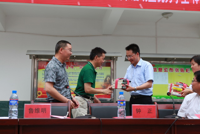曲江一中常务副校长陈勇刚向漩涡中学赠送书籍及教学光盘